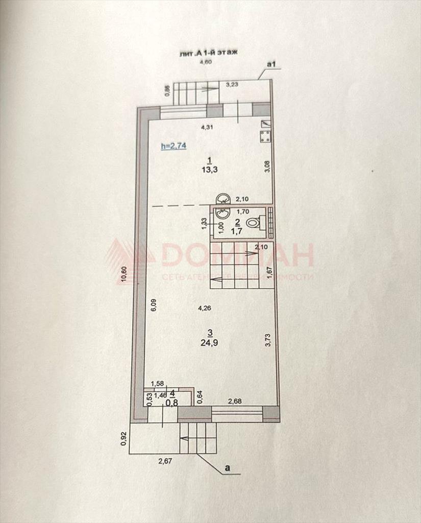 На первом этаже расположена кухня 13.3 кв.м. и комната под гостиную 24.9 кв.м. и совместный сан. узел. Высота потолков 2.74 м.